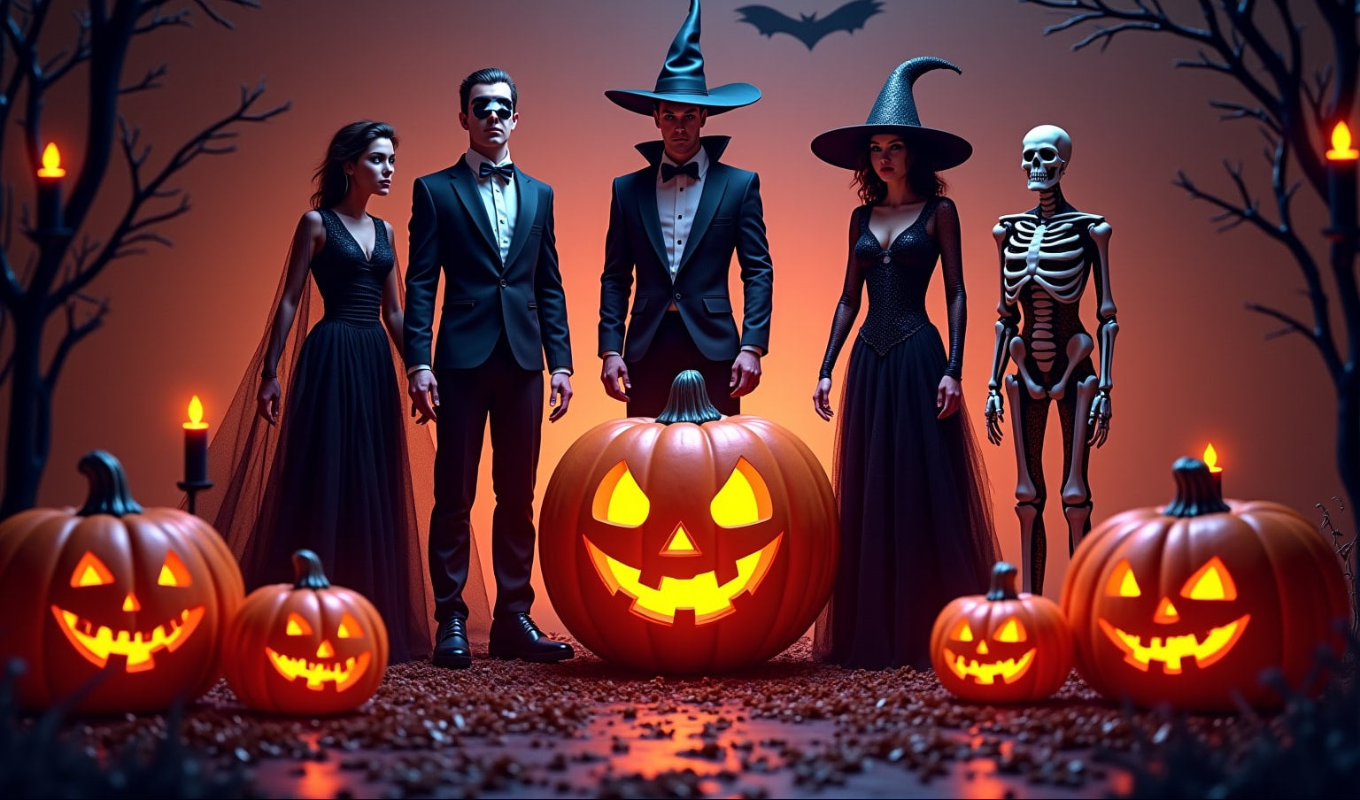 Whispers of autumn haunt the air, shadows dance as pumpkins glare.
